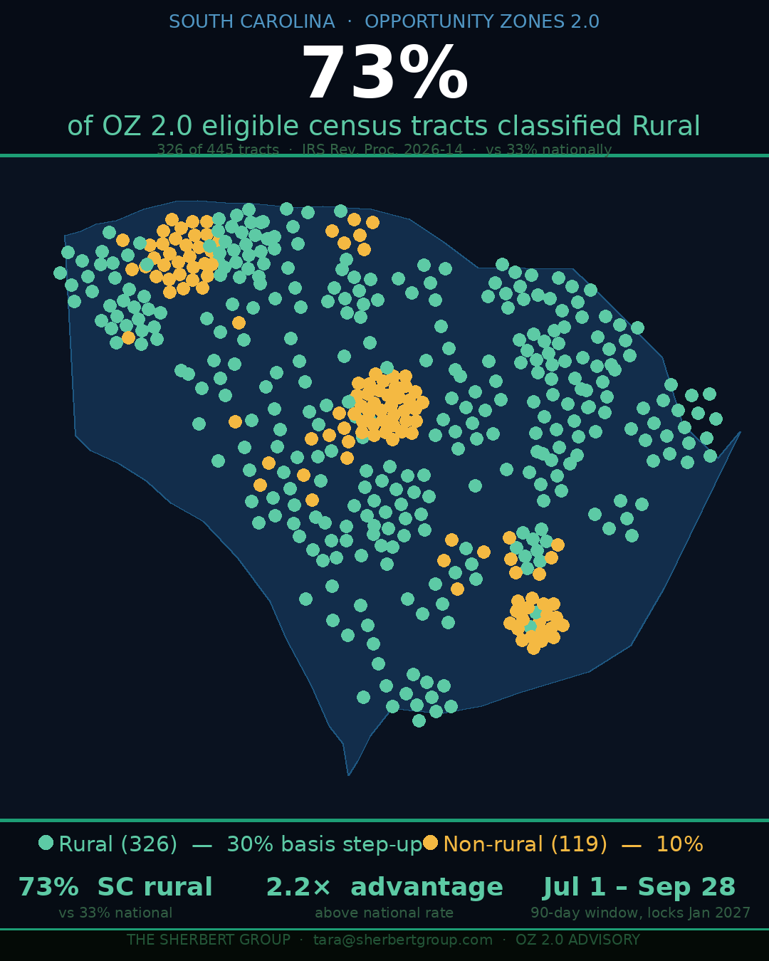 IRS Revenue Procedure 2026-14, issued April 6, 2026, officially confirmed the eligible census tract list for OZ 2.0 designations. When you run the numbers for South Carolina, one fact stands out: 73% of South Carolina’s 445 eligible OZ 2.0 tracts are classified as Rural — 326 tracts qualifying for a 30% basis step-up versus the standard 10%. The national average is 33% rural. South Carolina is running at more than twice that rate.